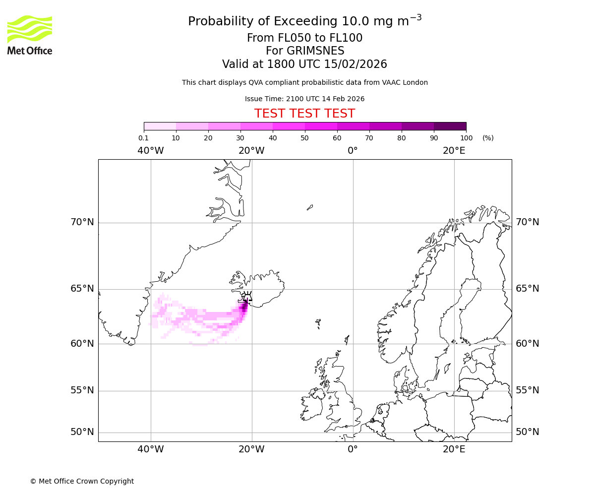 Probability of exceeding 10.0 milligrams per metre cubed. From 000 to 050 for GRIMSNES. Valid at 1800 UTC 15/02/2026