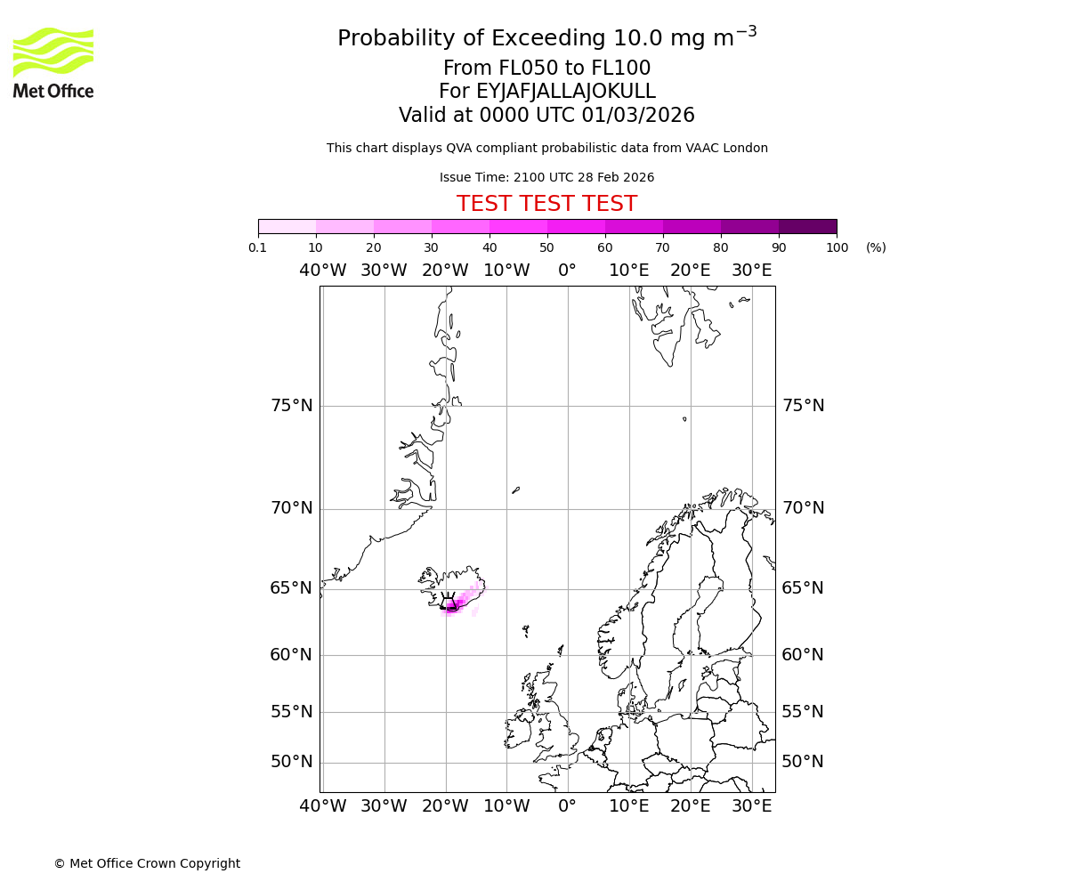 Probability of exceeding 10.0 milligrams per metre cubed. From 000 to 050 for EYJAFJALLAJOKULL. Valid at 0000 UTC 01/03/2026
