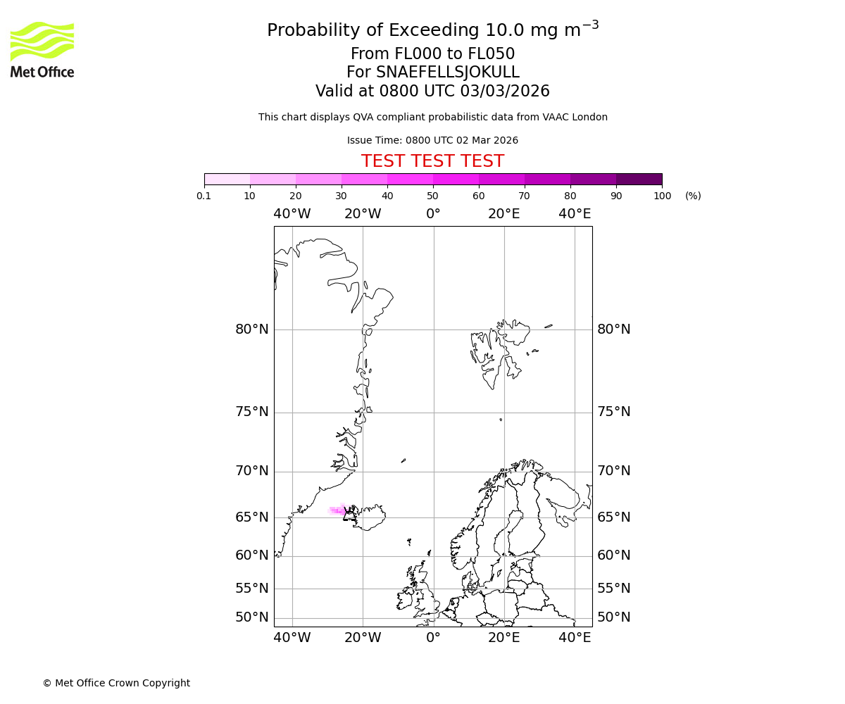 Probability of exceeding 10.0 milligrams per metre cubed. From 000 to 050 for SNAEFELLSJOKULL. Valid at 0500 UTC 03/03/2026