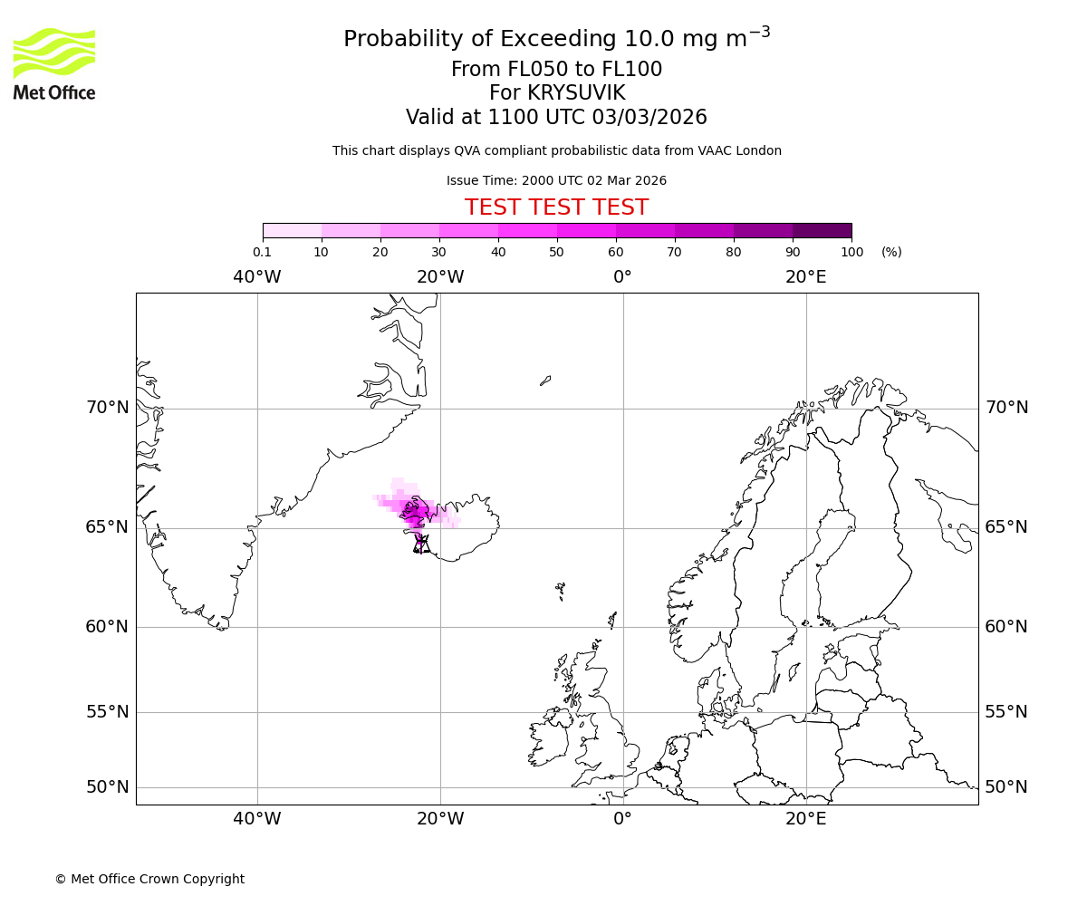 Quantitative Volcanic Ash charts (QVA) are produced in accordance with International Civil Aviation Organization (ICAO) Annex 3 requirements and are provided as well as the London Volcanic Ash Advisory Graphics (VAG) and Advisories (VAA). The lowest QVA threshold (0.2 mg/m³) matches to the areas depicted in the VAA and VAG. Both expected ash concentration and probabilistic forecast information is provided in the chart viewer below for eruptions occurring in the London Volcanic Ash Advisory Centre (VAAC) area of responsibility.