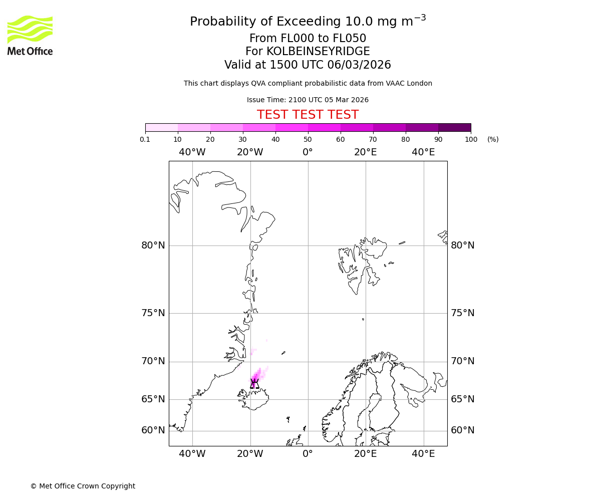 Probability of exceeding 10.0 milligrams per metre cubed. From 000 to 050 for KOLBEINSEYRIDGE. Valid at 1200 UTC 06/03/2026