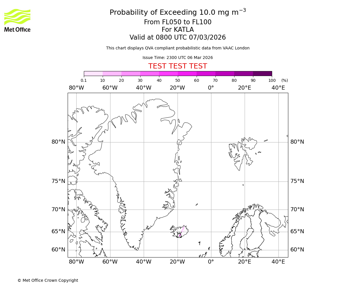 Probability of exceeding 10.0 milligrams per metre cubed. From 000 to 050 for KATLA. Valid at 0800 UTC 07/03/2026