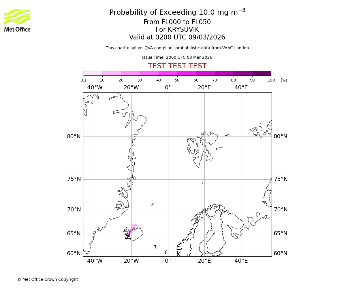 Probability of exceeding 10.0 milligrams per metre cubed. From 000 to 050 for KRYSUVIK. Valid at 2300 UTC 08/03/2026