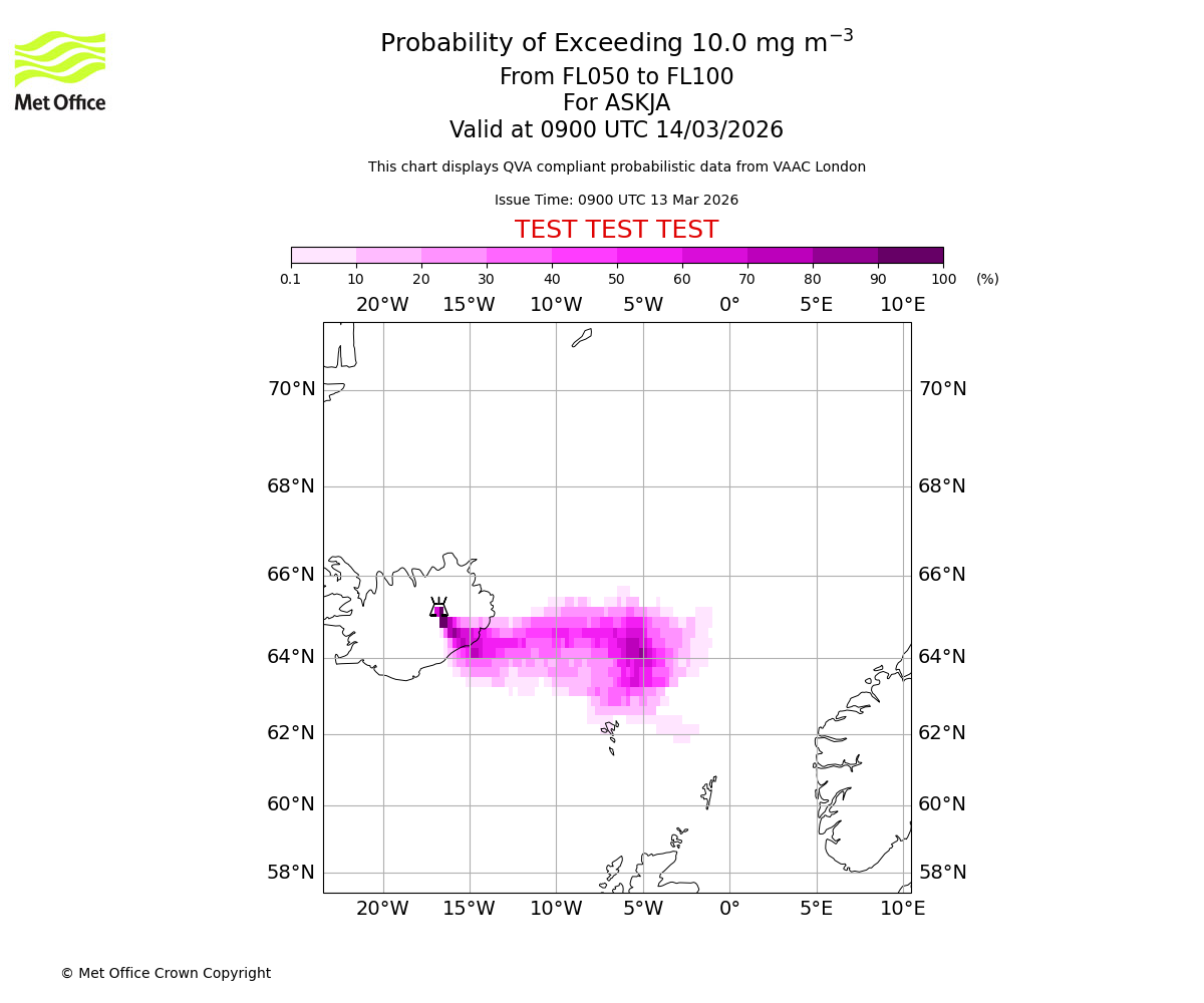 Probability of exceeding 10.0 milligrams per metre cubed. From 000 to 050 for ASKJA. Valid at 0900 UTC 14/03/2026