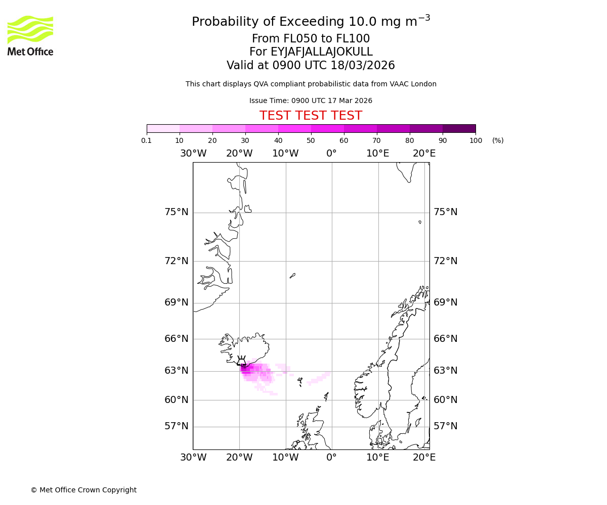 Probability of exceeding 10.0 milligrams per metre cubed. From 000 to 050 for EYJAFJALLAJOKULL. Valid at 0900 UTC 18/03/2026
