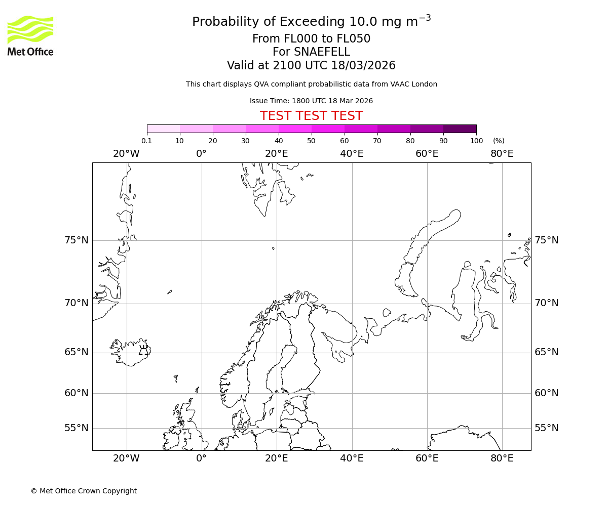 Probability of exceeding 10.0 milligrams per metre cubed. From 000 to 050 for SNAEFELL. Valid at 1800 UTC 18/03/2026