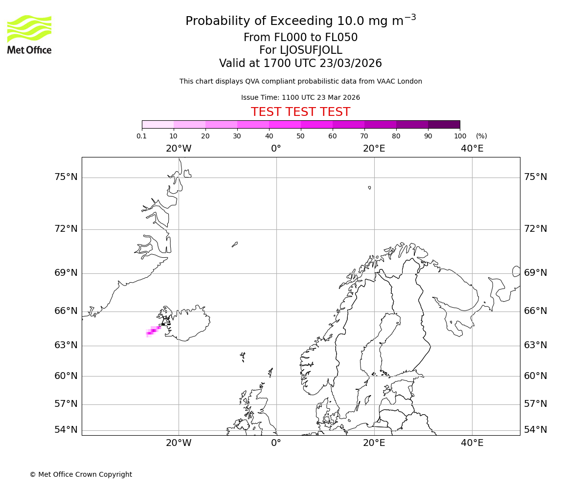 Modelled ash concentration from 000 to 050 for LJOSUFJOLL. Valid at 1100 UTC 23/03/2026