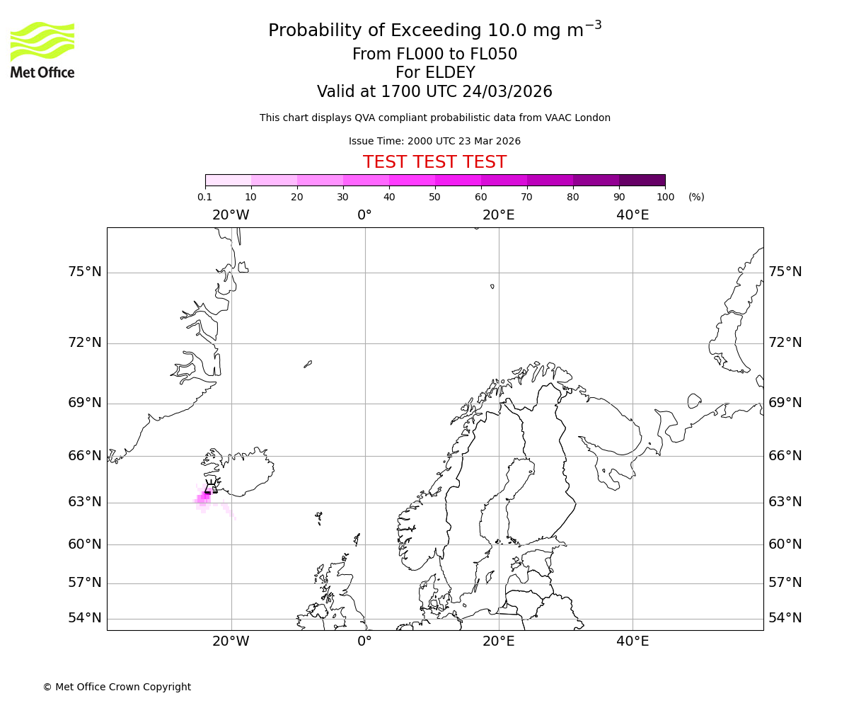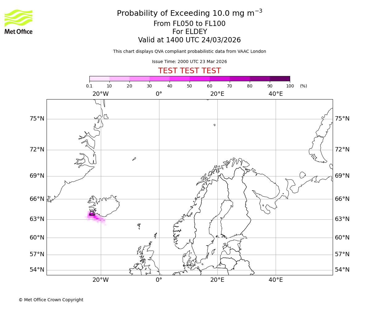 Quantitative Volcanic Ash charts (QVA) are produced in accordance with International Civil Aviation Organization (ICAO) Annex 3 requirements and are provided as well as the London Volcanic Ash Advisory Graphics (VAG) and Advisories (VAA). The lowest QVA threshold (0.2 mg/m³) matches to the areas depicted in the VAA and VAG. Both expected ash concentration and probabilistic forecast information is provided in the chart viewer below for eruptions occurring in the London Volcanic Ash Advisory Centre (VAAC) area of responsibility.