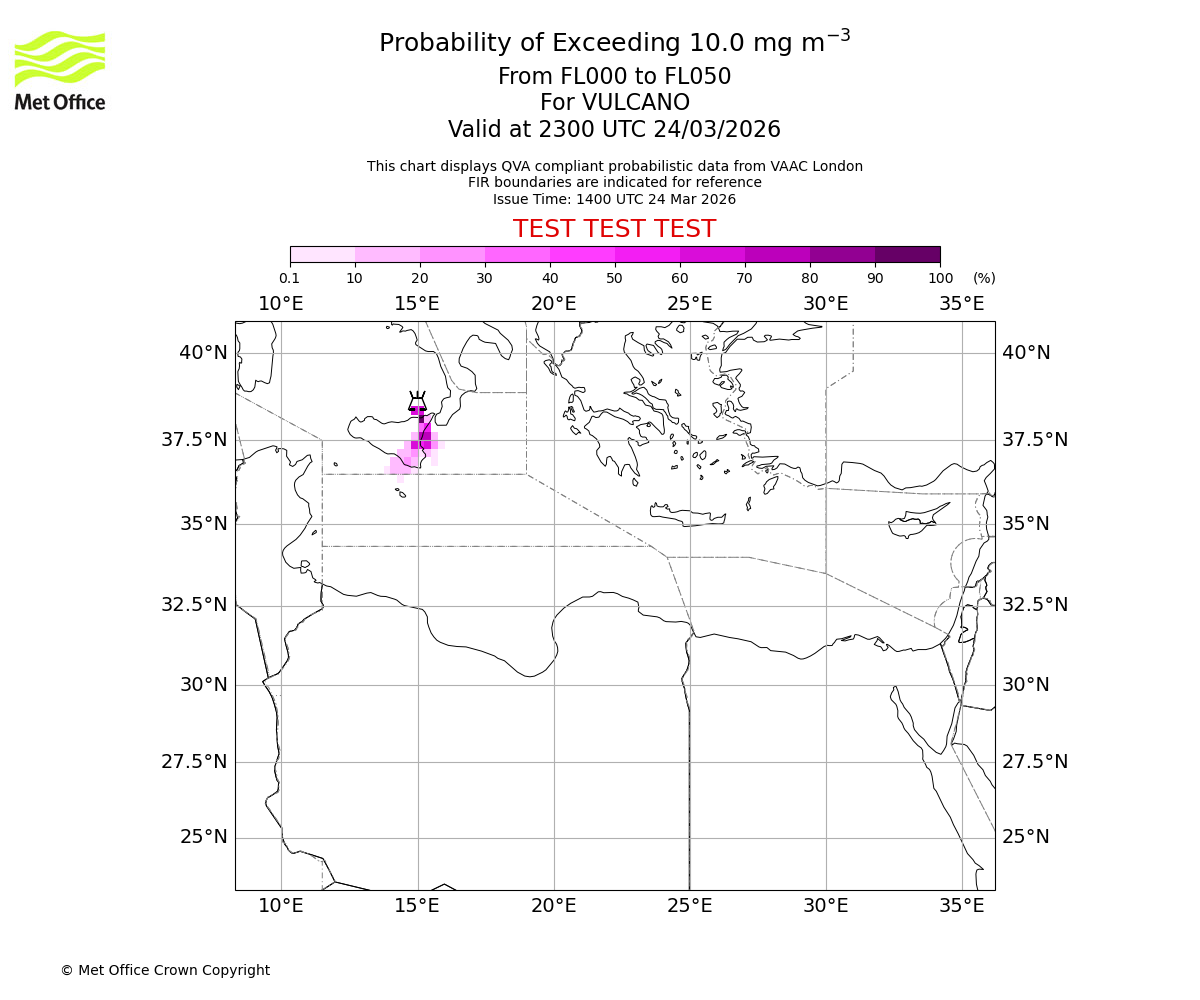 Probability of exceeding 10.0 milligrams per metre cubed. From 000 to 050 for VULCANO. Valid at 2000 UTC 24/03/2026