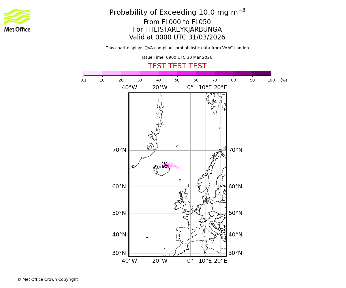 Probability of exceeding 10.0 milligrams per metre cubed. From 000 to 050 for THEISTAREYKJARBUNGA. Valid at 2100 UTC 30/03/2026