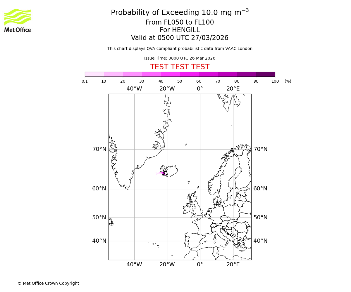 Probability of exceeding 10.0 milligrams per metre cubed. From 000 to 050 for HENGILL. Valid at 0500 UTC 27/03/2026
