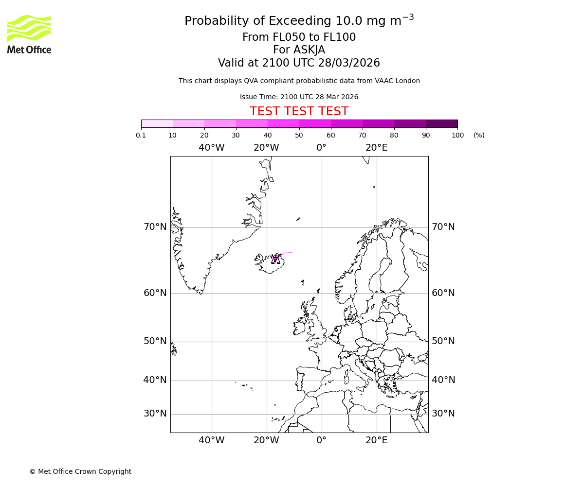 Probability of exceeding 10.0 milligrams per metre cubed. From 000 to 050 for ASKJA. Valid at 2100 UTC 28/03/2026