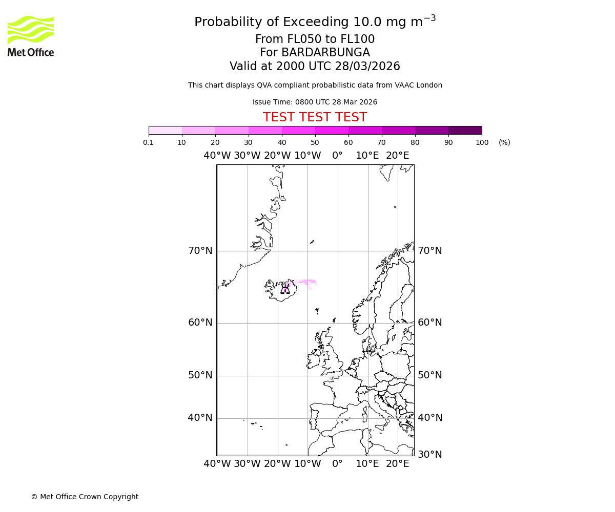 Probability of exceeding 10.0 milligrams per metre cubed. From 000 to 050 for BARDARBUNGA. Valid at 2000 UTC 28/03/2026