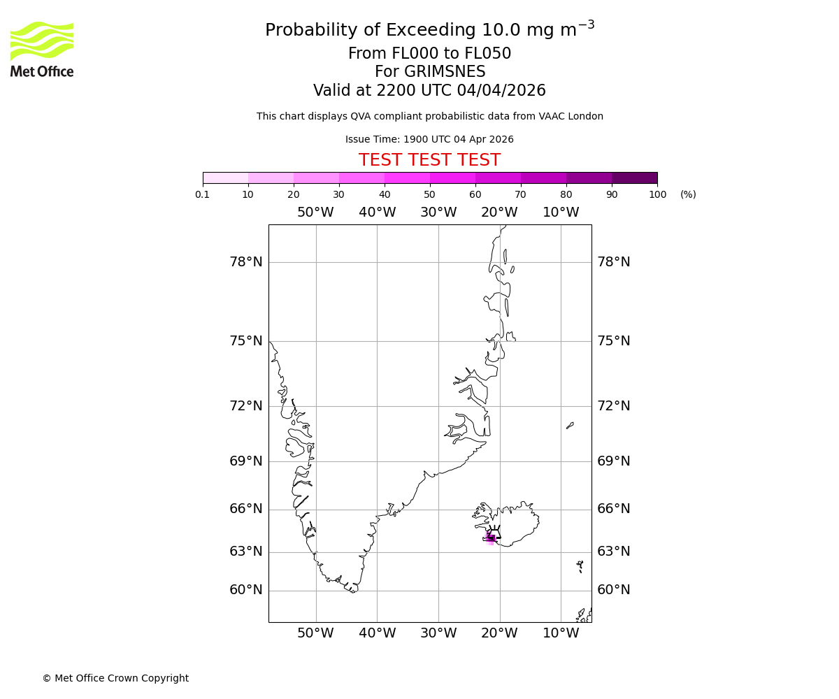 Probability of exceeding 10.0 milligrams per metre cubed. From 000 to 050 for GRIMSNES. Valid at 1900 UTC 04/04/2026