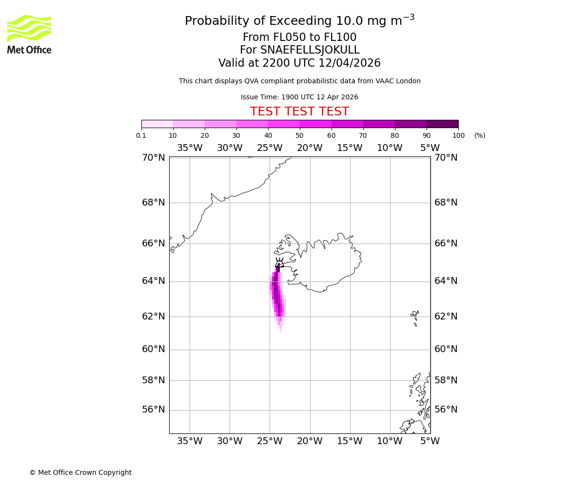 Probability of exceeding 10.0 milligrams per metre cubed. From 000 to 050 for SNAEFELLSJOKULL. Valid at 2200 UTC 12/04/2026
