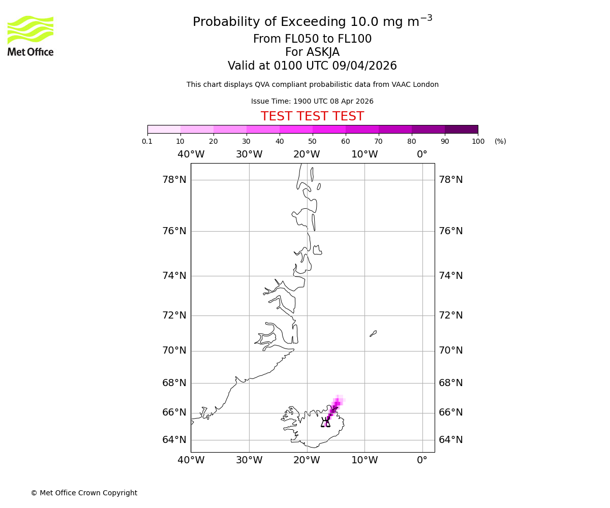Probability of exceeding 10.0 milligrams per metre cubed. From 000 to 050 for ASKJA. Valid at 0100 UTC 09/04/2026