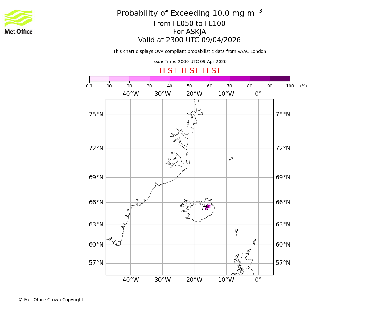 Probability of exceeding 10.0 milligrams per metre cubed. From 000 to 050 for ASKJA. Valid at 2300 UTC 09/04/2026