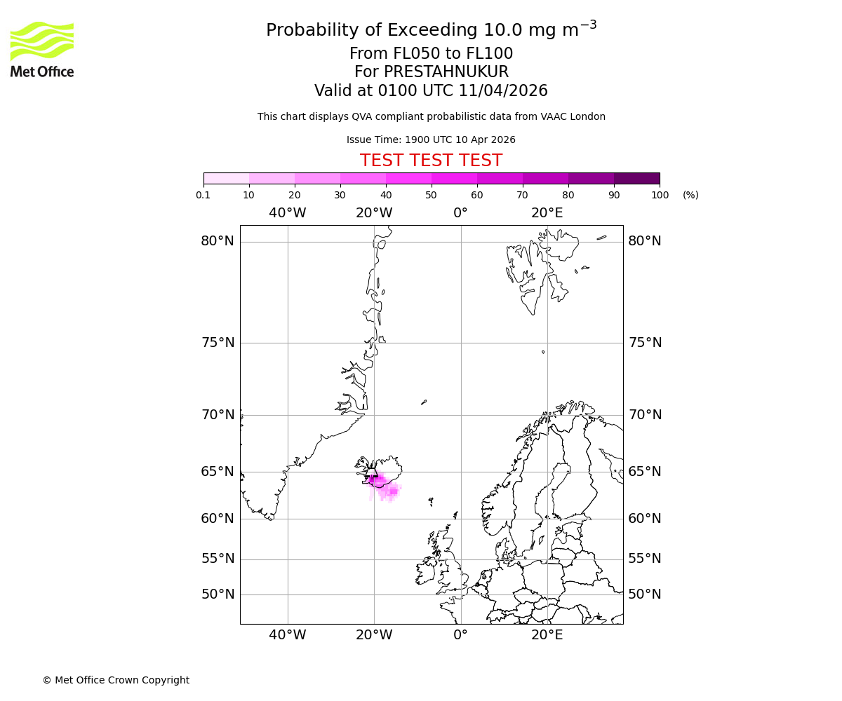 Modelled ash concentration from 000 to 050 for PRESTAHNUKUR. Valid at 1900 UTC 10/04/2026