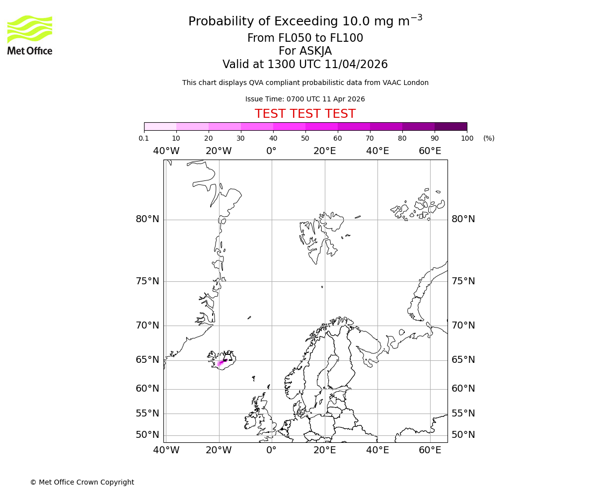 Probability of exceeding 10.0 milligrams per metre cubed. From 000 to 050 for ASKJA. Valid at 1300 UTC 11/04/2026