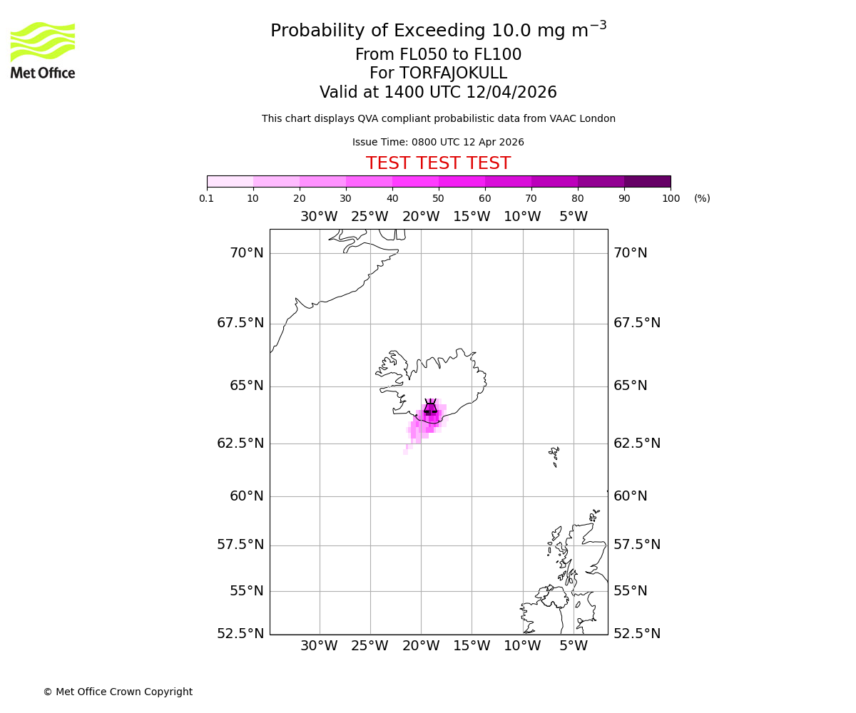 Probability of exceeding 10.0 milligrams per metre cubed. From 000 to 050 for TORFAJOKULL. Valid at 1400 UTC 12/04/2026