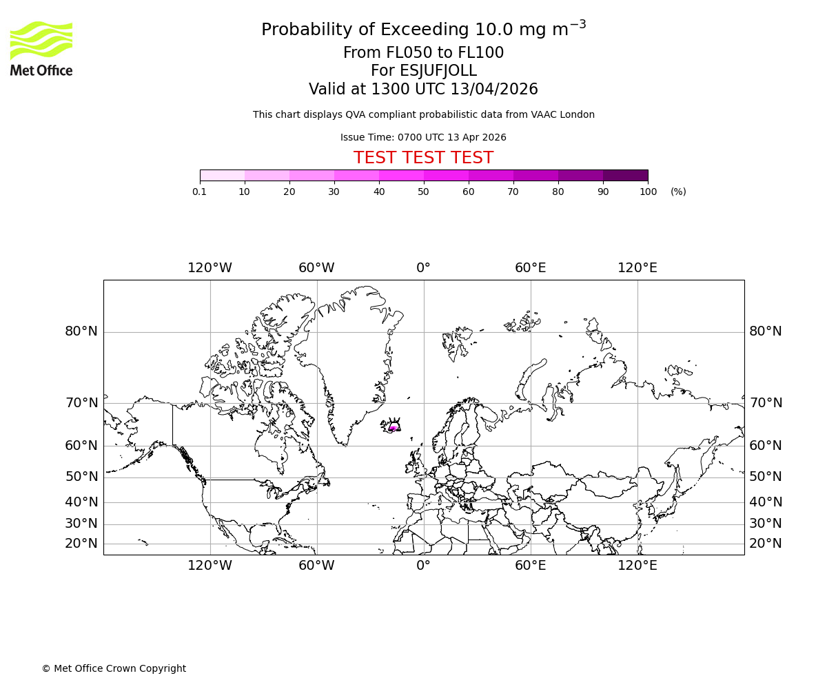 Quantitative Volcanic Ash charts (QVA) are produced in accordance with International Civil Aviation Organization (ICAO) Annex 3 requirements and are provided as well as the London Volcanic Ash Advisory Graphics (VAG) and Advisories (VAA). The lowest QVA threshold (0.2 mg/m³) matches to the areas depicted in the VAA and VAG. Both expected ash concentration and probabilistic forecast information is provided in the chart viewer below for eruptions occurring in the London Volcanic Ash Advisory Centre (VAAC) area of responsibility.