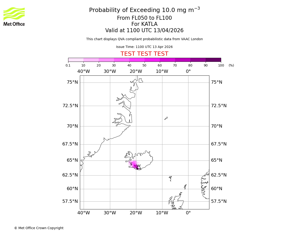 Probability of exceeding 10.0 milligrams per metre cubed. From 000 to 050 for KATLA. Valid at 1100 UTC 13/04/2026