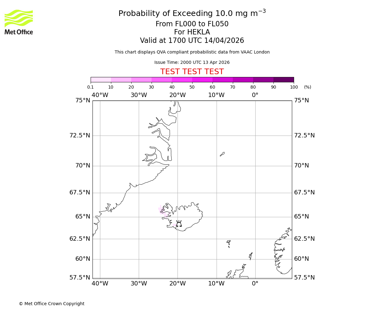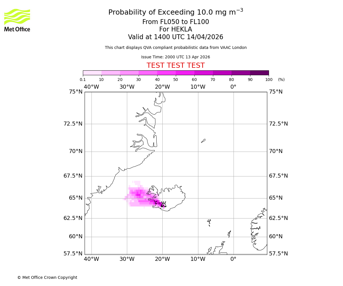 Probability of exceeding 10.0 milligrams per metre cubed. From 000 to 050 for HEKLA. Valid at 1400 UTC 14/04/2026