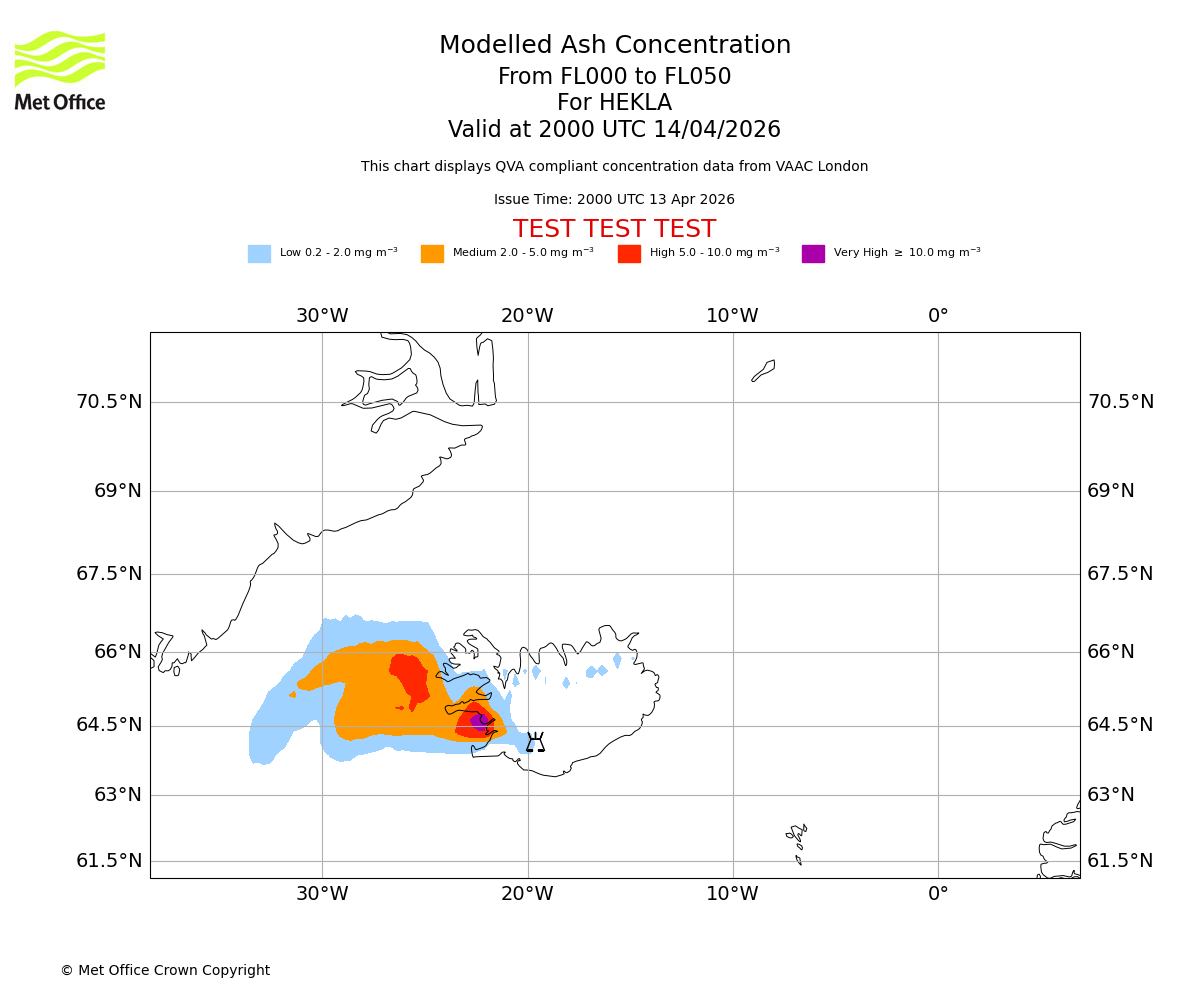 Modelled ash concentration from 000 to 200 for HEKLA. Valid at 2000 UTC 13/04/2026