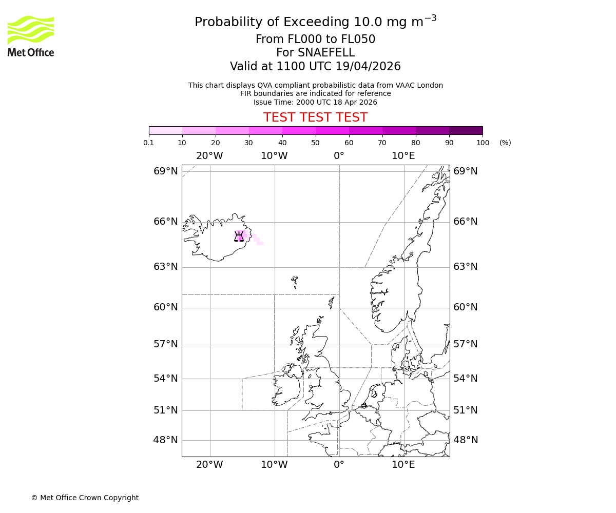 Probability of exceeding 10.0 milligrams per metre cubed. From 000 to 050 for SNAEFELL. Valid at 0800 UTC 19/04/2026