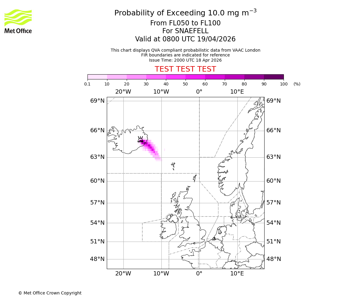 Quantitative Volcanic Ash charts (QVA) are produced in accordance with International Civil Aviation Organization (ICAO) Annex 3 requirements and are provided as well as the London Volcanic Ash Advisory Graphics (VAG) and Advisories (VAA). The lowest QVA threshold (0.2 mg/m³) matches to the areas depicted in the VAA and VAG. Both expected ash concentration and probabilistic forecast information is provided in the chart viewer below for eruptions occurring in the London Volcanic Ash Advisory Centre (VAAC) area of responsibility.