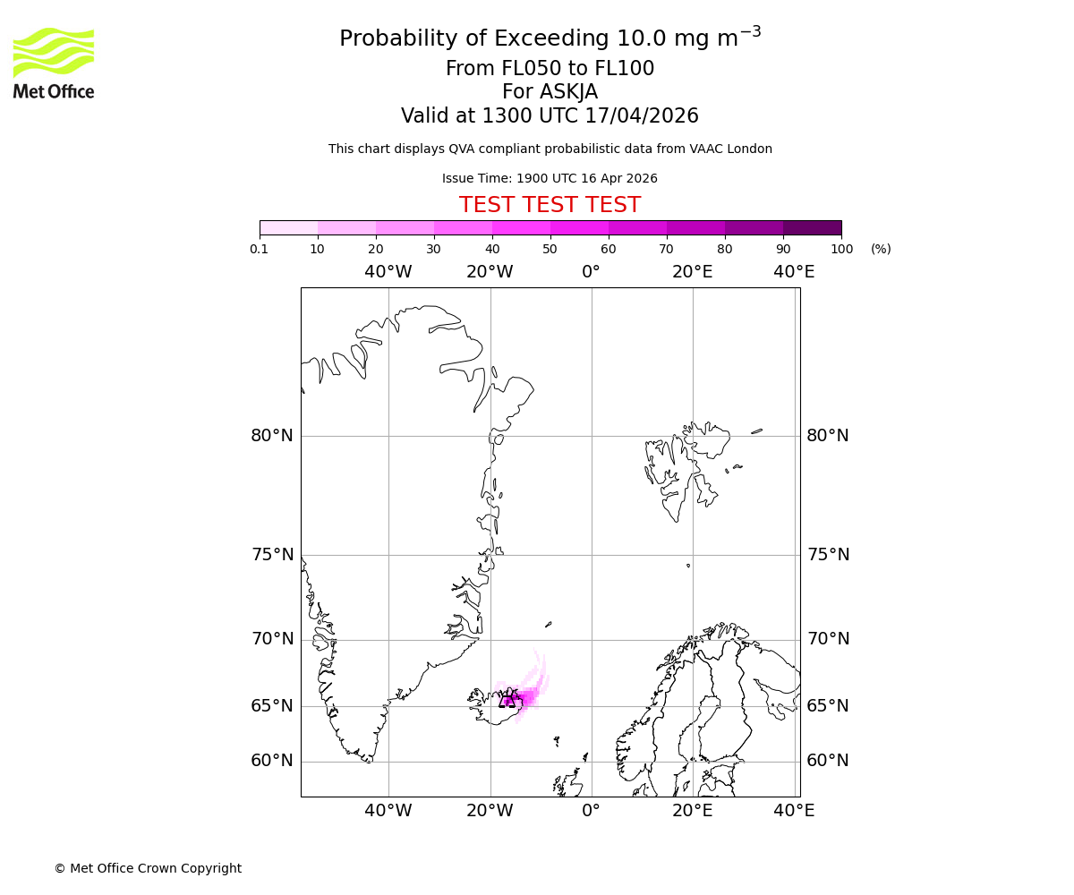 Probability of exceeding 10.0 milligrams per metre cubed. From 000 to 050 for ASKJA. Valid at 1300 UTC 17/04/2026
