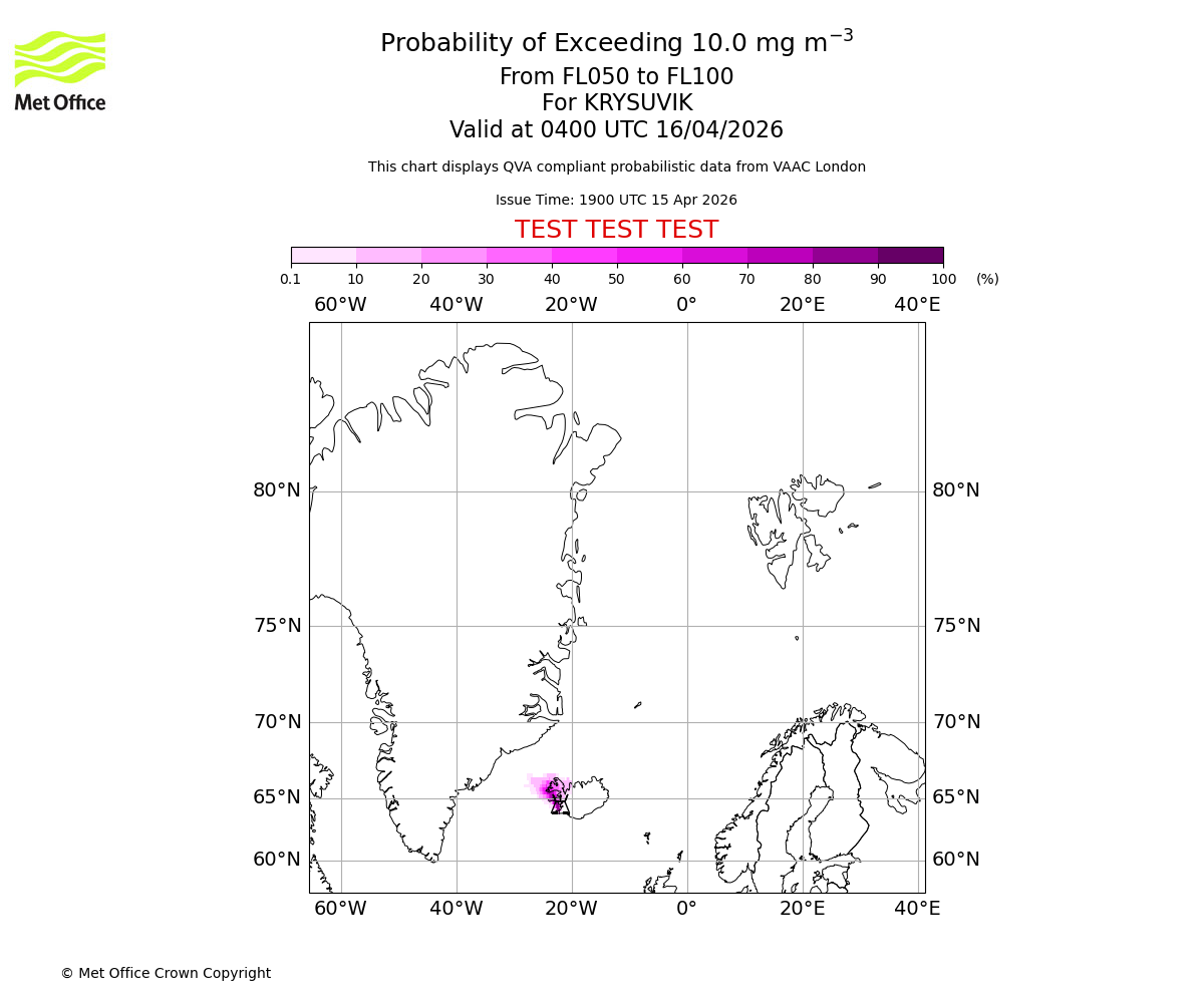 Probability of exceeding 10.0 milligrams per metre cubed. From 000 to 050 for KRYSUVIK. Valid at 0400 UTC 16/04/2026