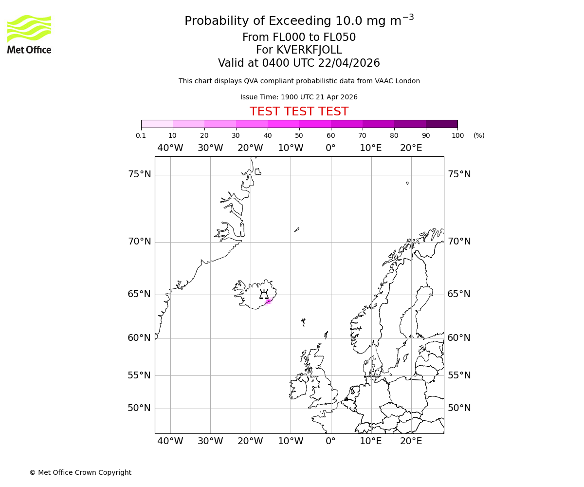 Modelled ash concentration from 000 to 050 for KVERKFJOLL. Valid at 1900 UTC 21/04/2026