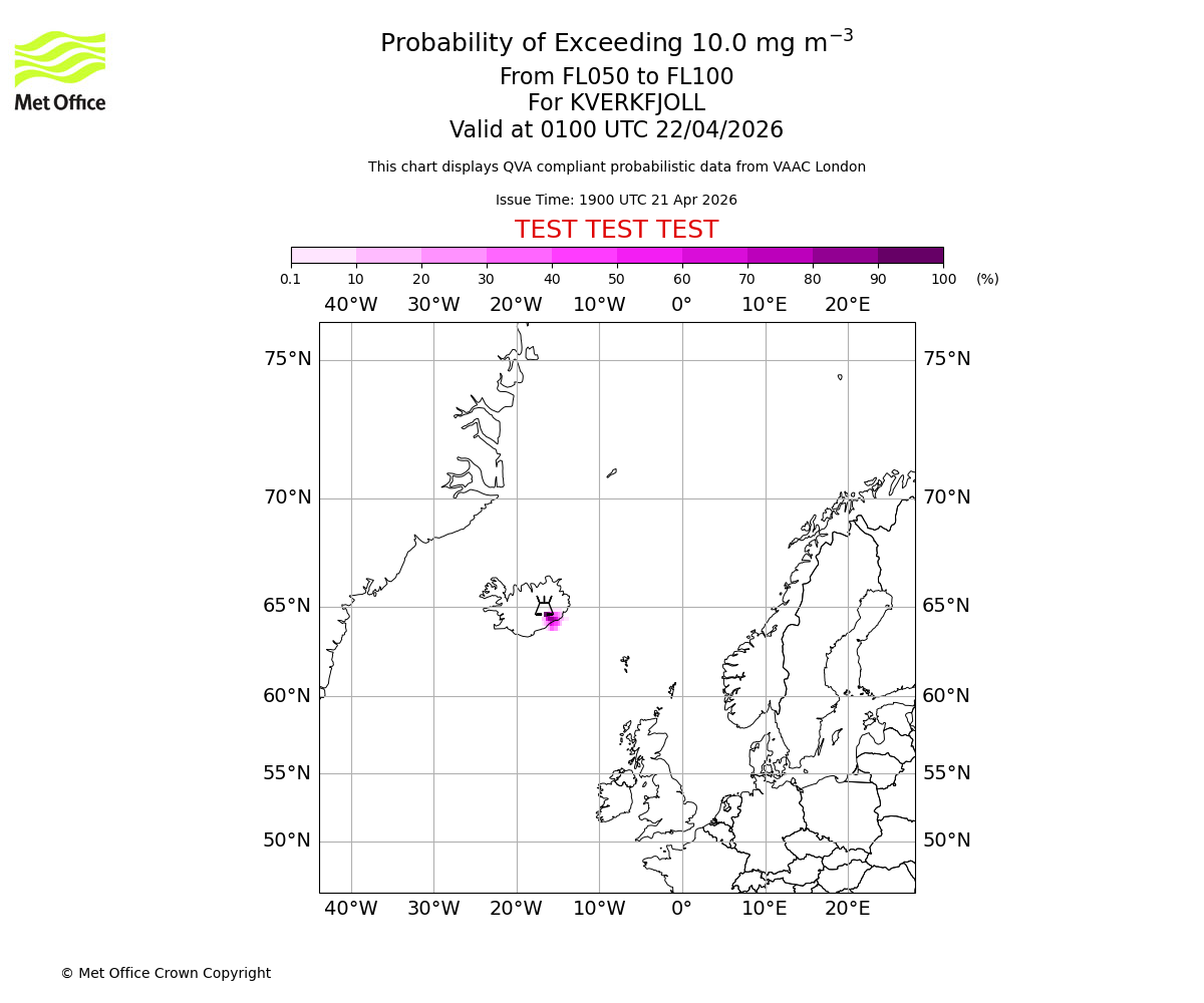Probability of exceeding 10.0 milligrams per metre cubed. From 000 to 050 for KVERKFJOLL. Valid at 0100 UTC 22/04/2026