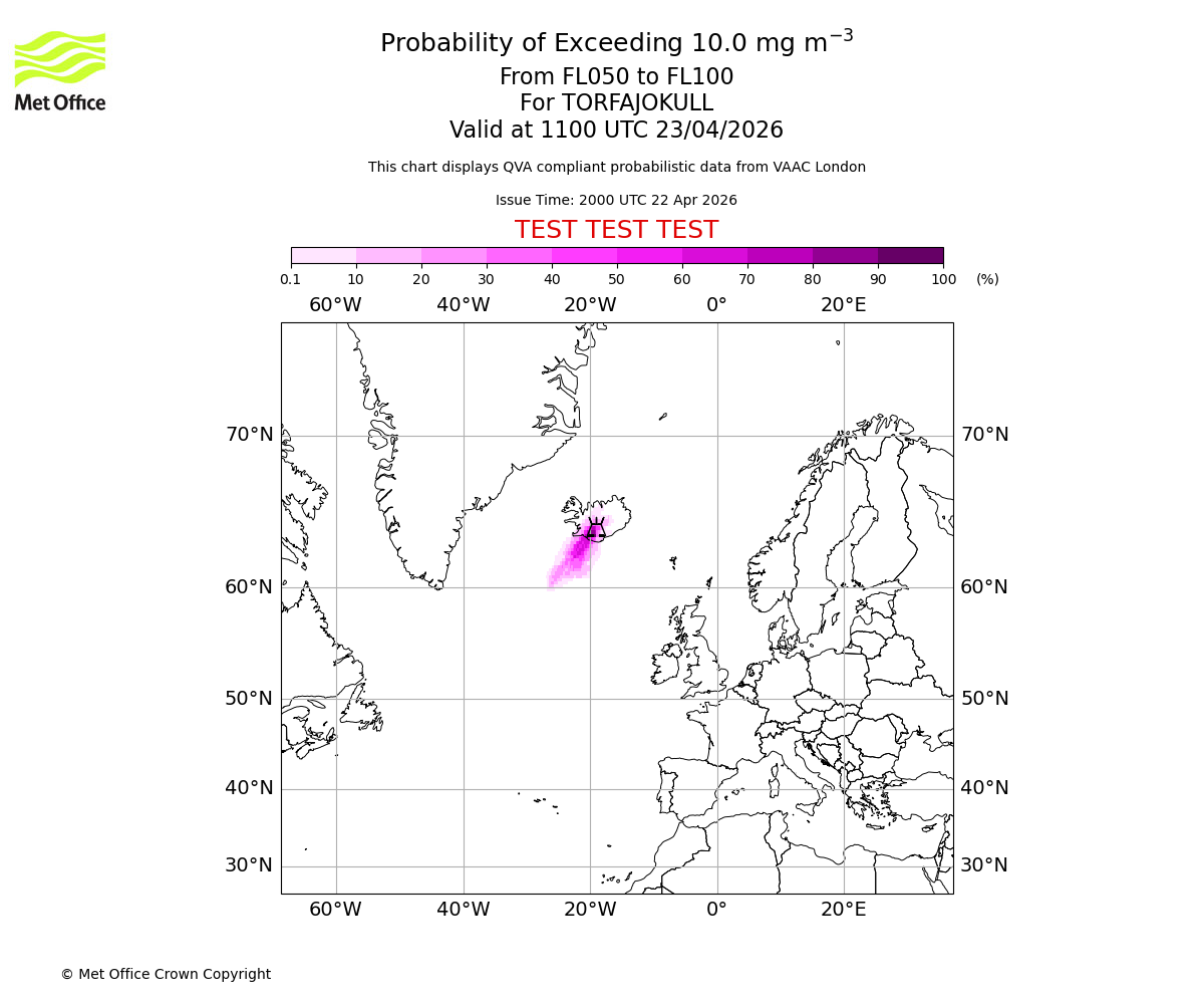 Probability of exceeding 10.0 milligrams per metre cubed. From 000 to 050 for TORFAJOKULL. Valid at 1100 UTC 23/04/2026