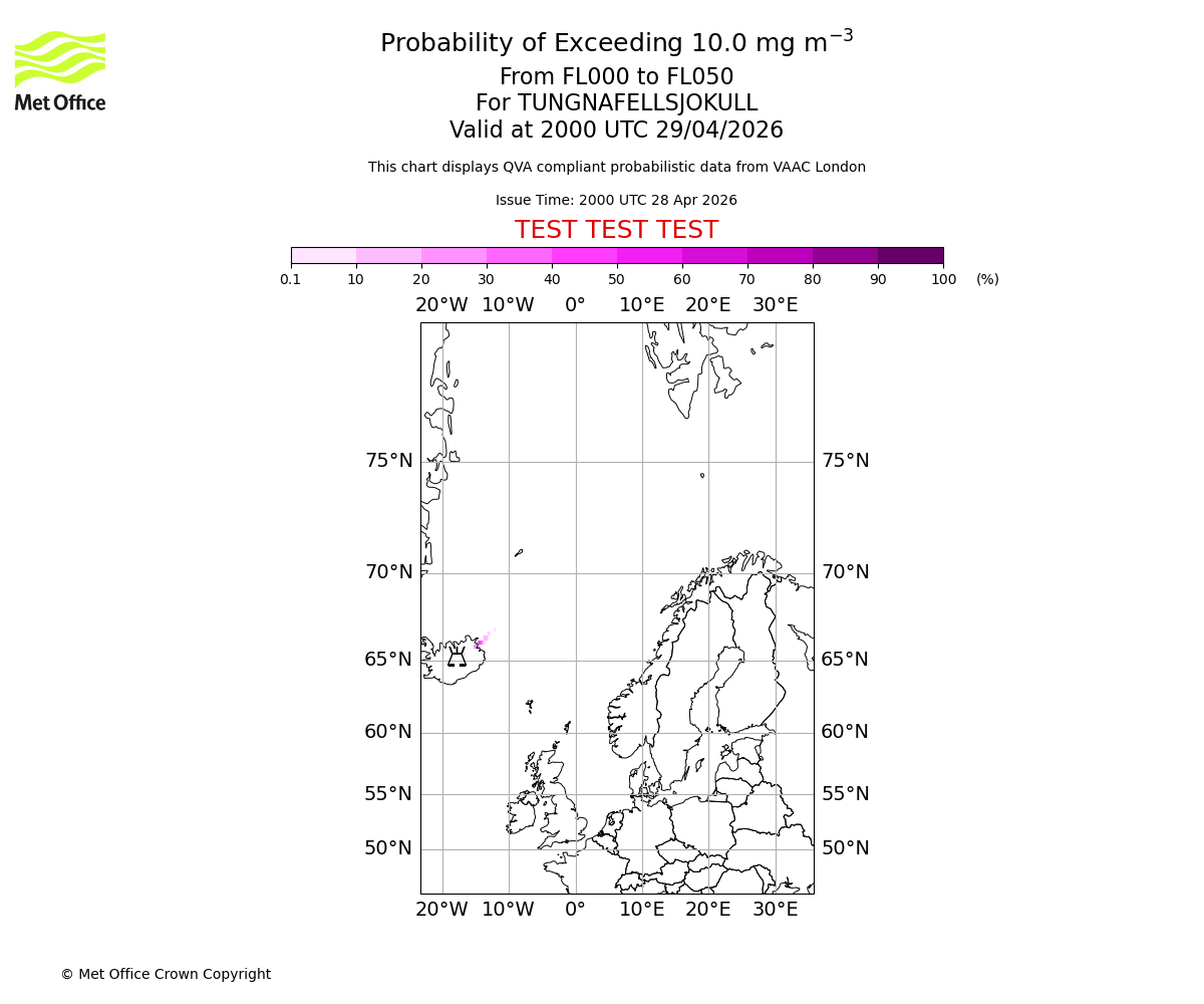 Modelled ash concentration from 000 to 050 for TUNGNAFELLSJOKULL. Valid at 2000 UTC 28/04/2026