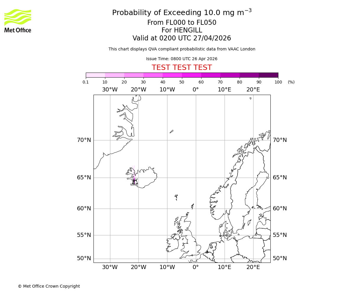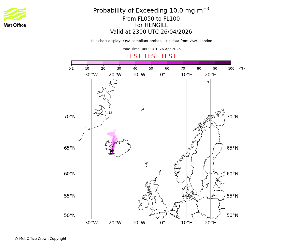 Probability of exceeding 10.0 milligrams per metre cubed. From 000 to 050 for HENGILL. Valid at 2300 UTC 26/04/2026