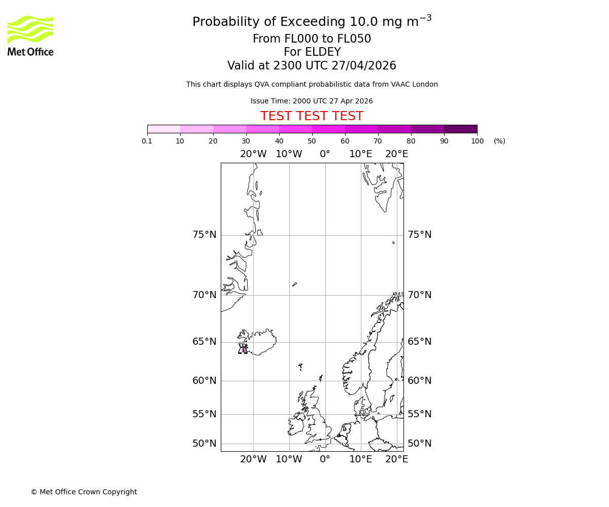 Modelled ash concentration from 000 to 050 for ELDEY. Valid at 2000 UTC 27/04/2026