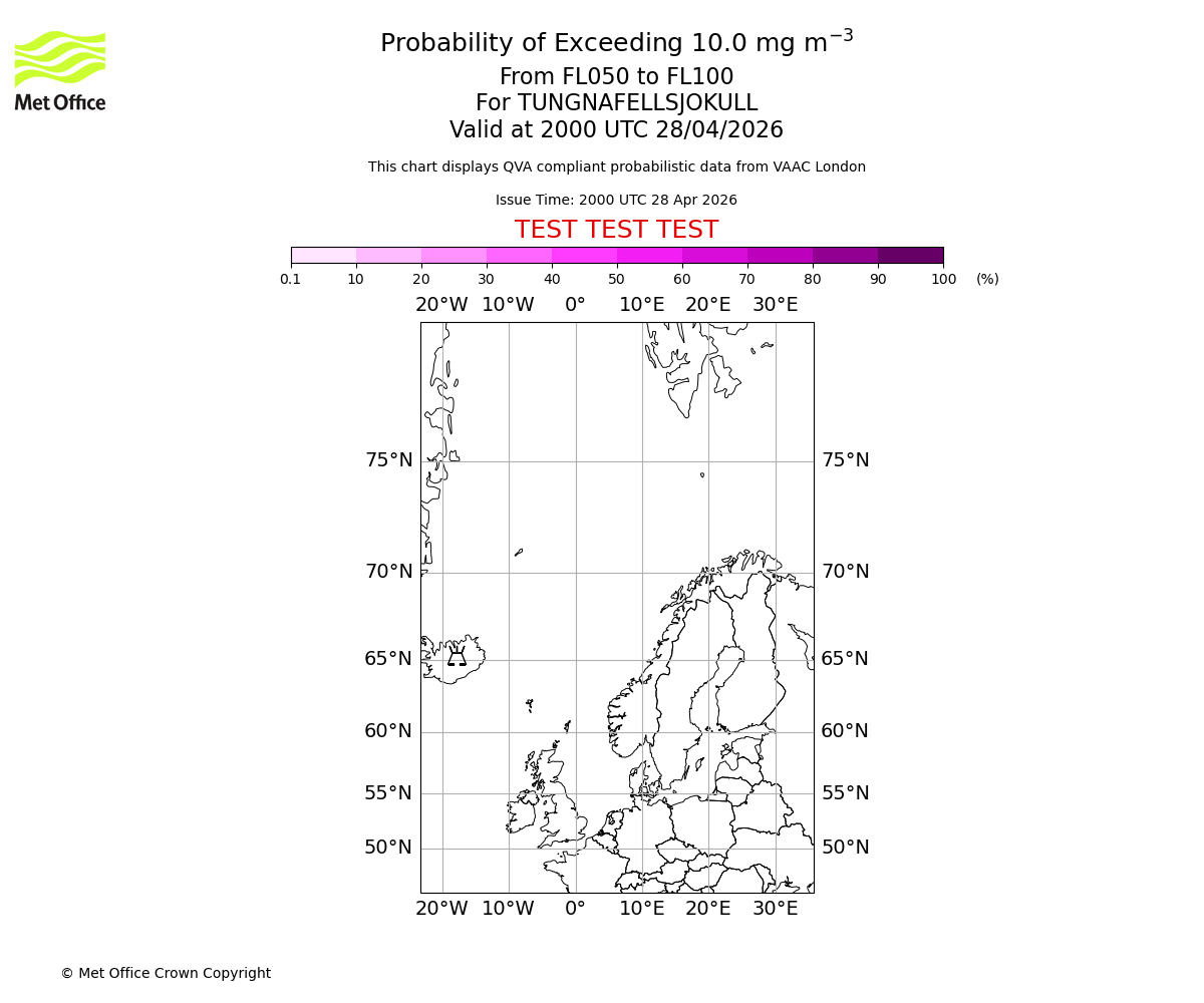 Probability of exceeding 10.0 milligrams per metre cubed. From 000 to 050 for TUNGNAFELLSJOKULL. Valid at 2000 UTC 28/04/2026