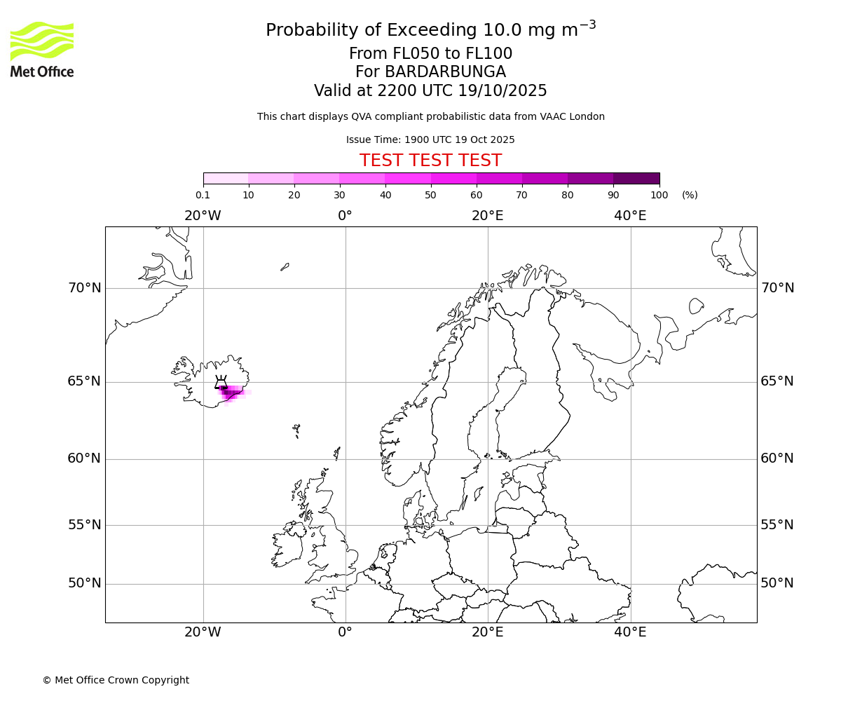 Probability of exceeding 10.0 milligrams per metre cubed. From 000 to 050 for BARDARBUNGA. Valid at 2200 UTC 19/10/2025