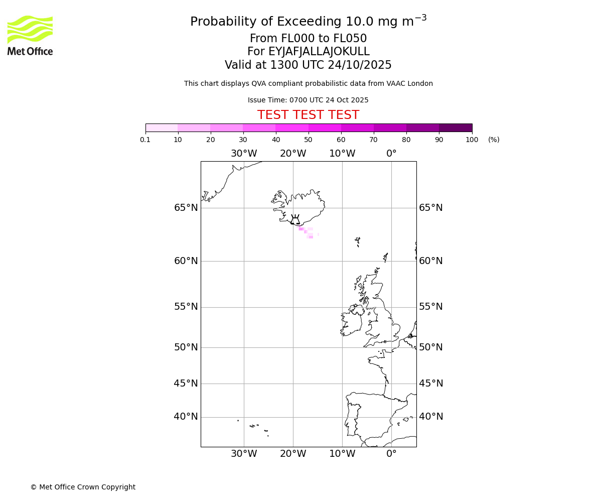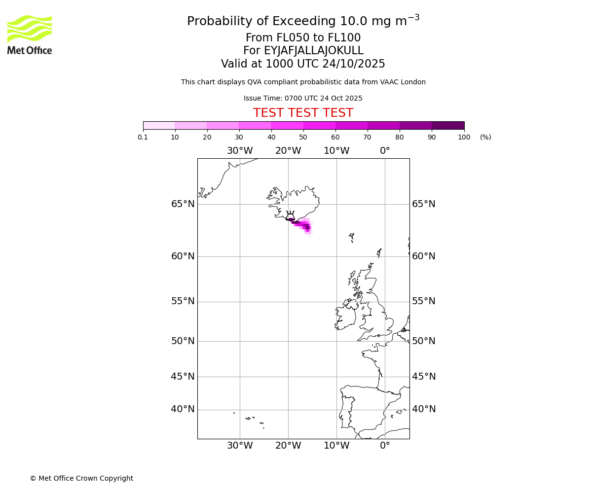Probability of exceeding 10.0 milligrams per metre cubed. From 000 to 050 for EYJAFJALLAJOKULL. Valid at 1000 UTC 24/10/2025