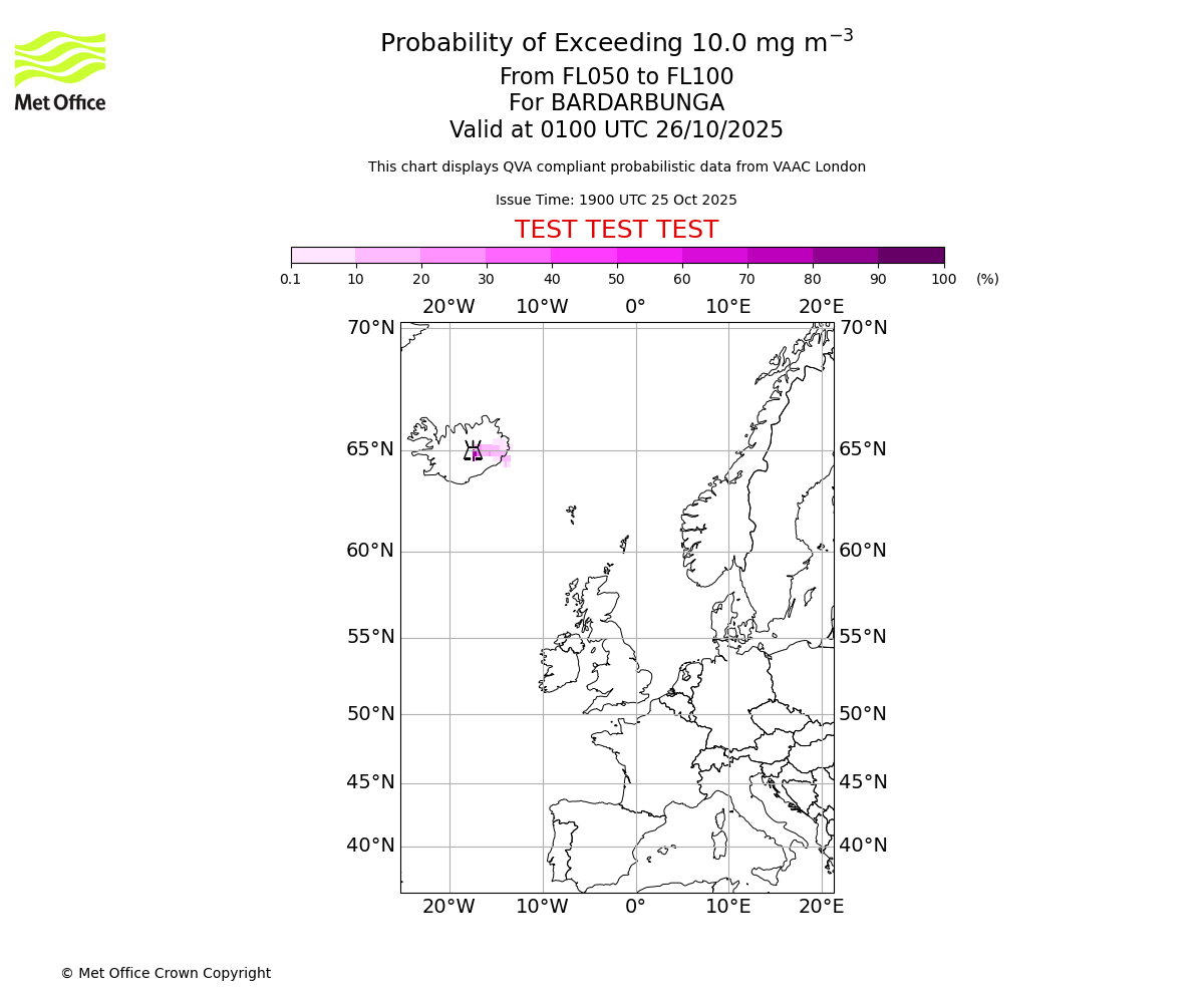 Probability of exceeding 10.0 milligrams per metre cubed. From 000 to 050 for BARDARBUNGA. Valid at 0100 UTC 26/10/2025