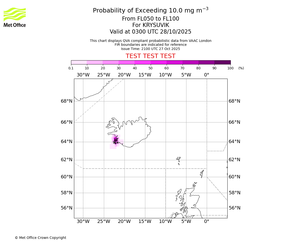 Probability of exceeding 10.0 milligrams per metre cubed. From 000 to 050 for KRYSUVIK. Valid at 0300 UTC 28/10/2025