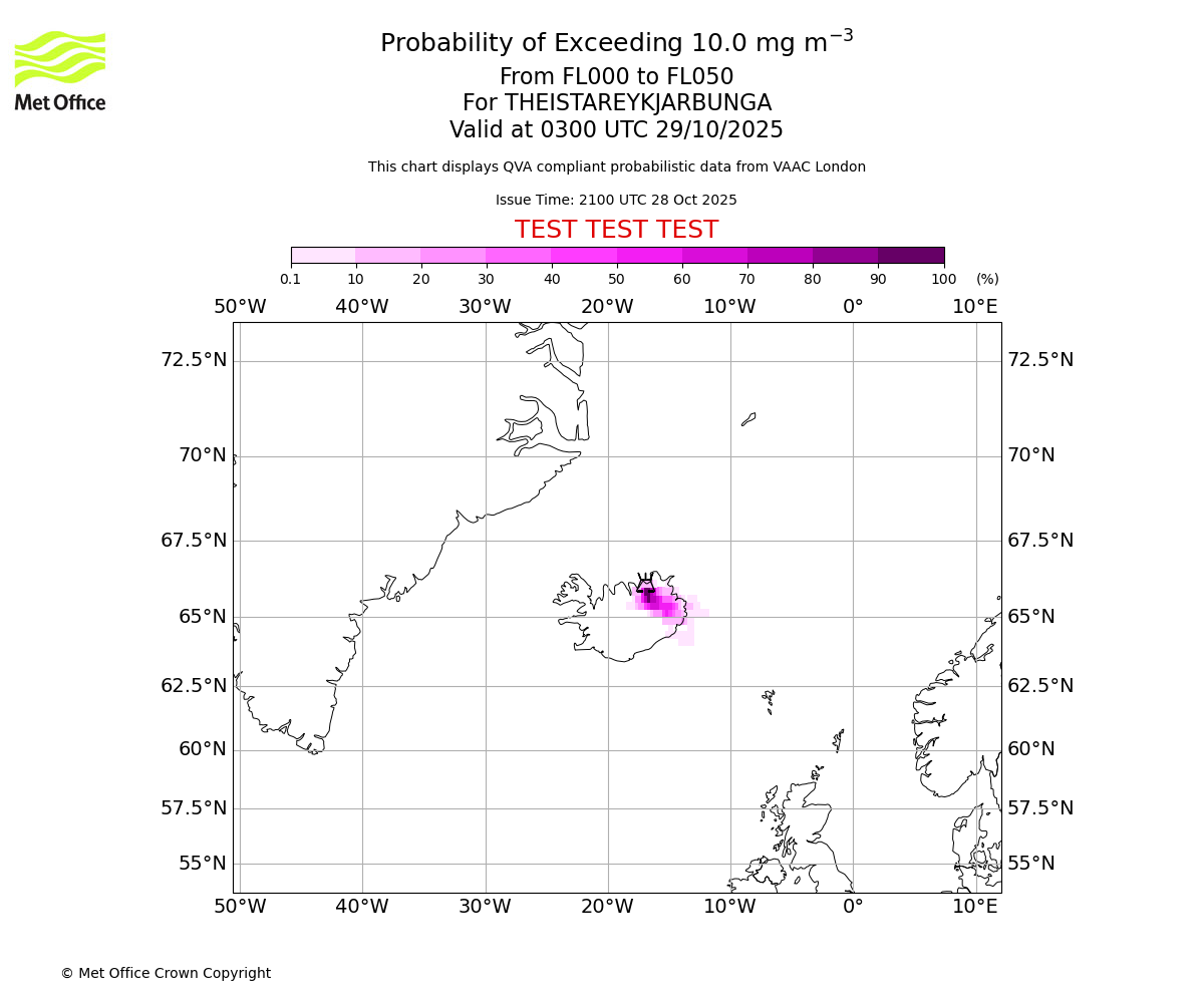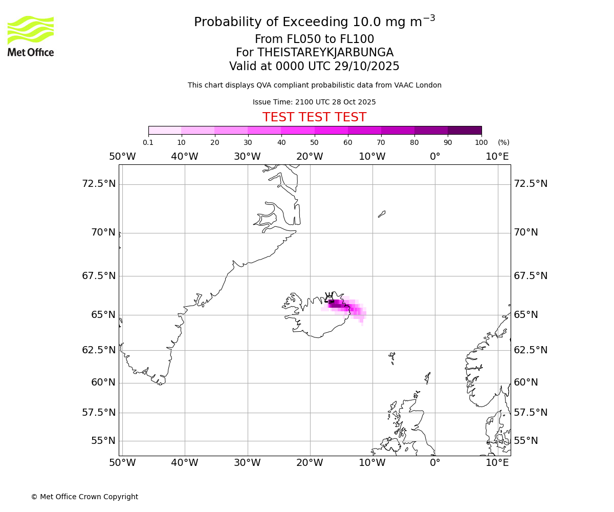 Probability of exceeding 10.0 milligrams per metre cubed. From 000 to 050 for THEISTAREYKJARBUNGA. Valid at 0000 UTC 29/10/2025