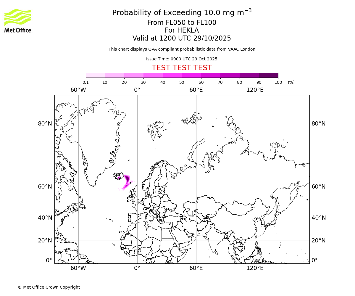 Probability of exceeding 10.0 milligrams per metre cubed. From 000 to 050 for HEKLA. Valid at 1200 UTC 29/10/2025