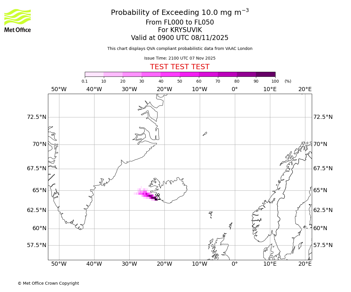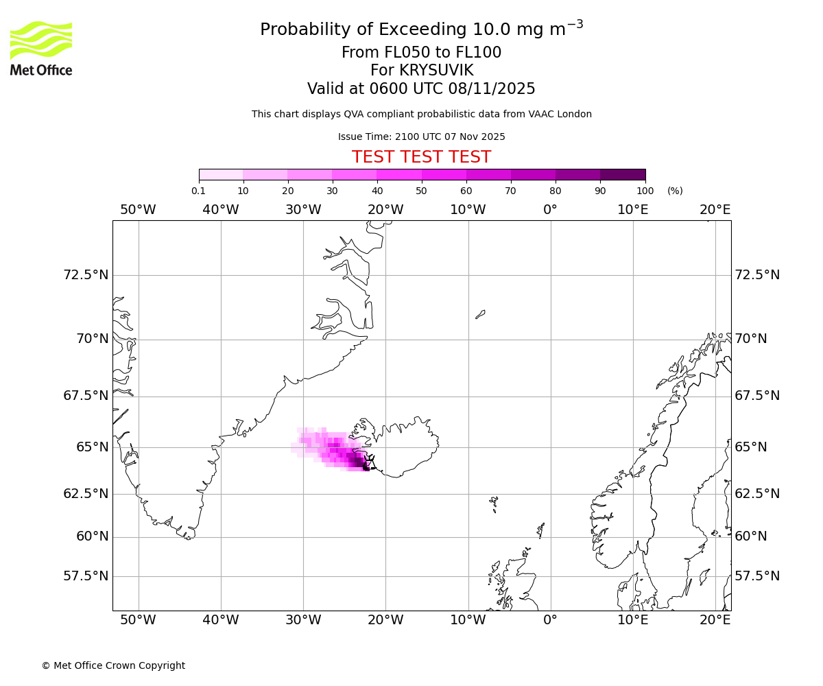 In accordance with ICAO Annex 3, Amendment 82 VAAC London will provide operational QVA forecasts from 27 November 2025 and these will be made available via a VAAC London QVA API information service. These charts are currently provided for test and evaluation purposes (not for operational use) until the introduction of the operational service.