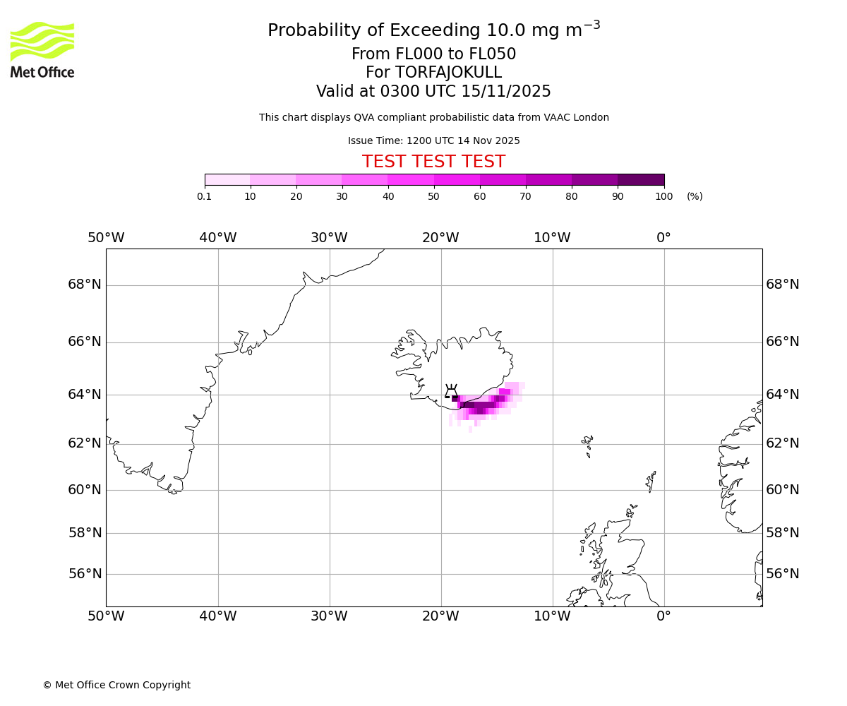 Probability of exceeding 10.0 milligrams per metre cubed. From 000 to 050 for TORFAJOKULL. Valid at 0000 UTC 15/11/2025