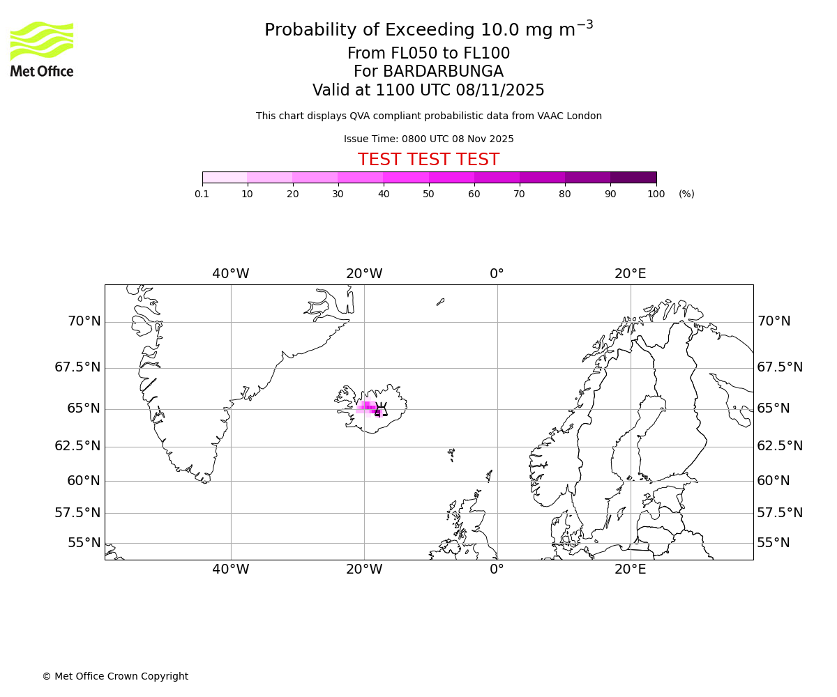 Probability of exceeding 10.0 milligrams per metre cubed. From 000 to 050 for BARDARBUNGA. Valid at 1100 UTC 08/11/2025