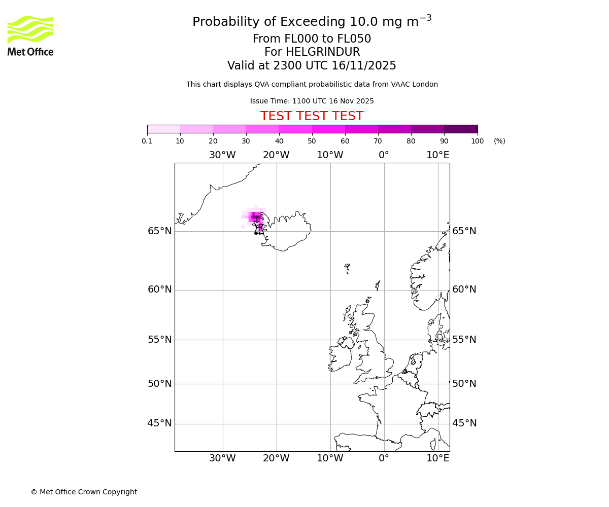Probability of exceeding 10.0 milligrams per metre cubed. From 000 to 050 for HELGRINDUR. Valid at 2000 UTC 16/11/2025
