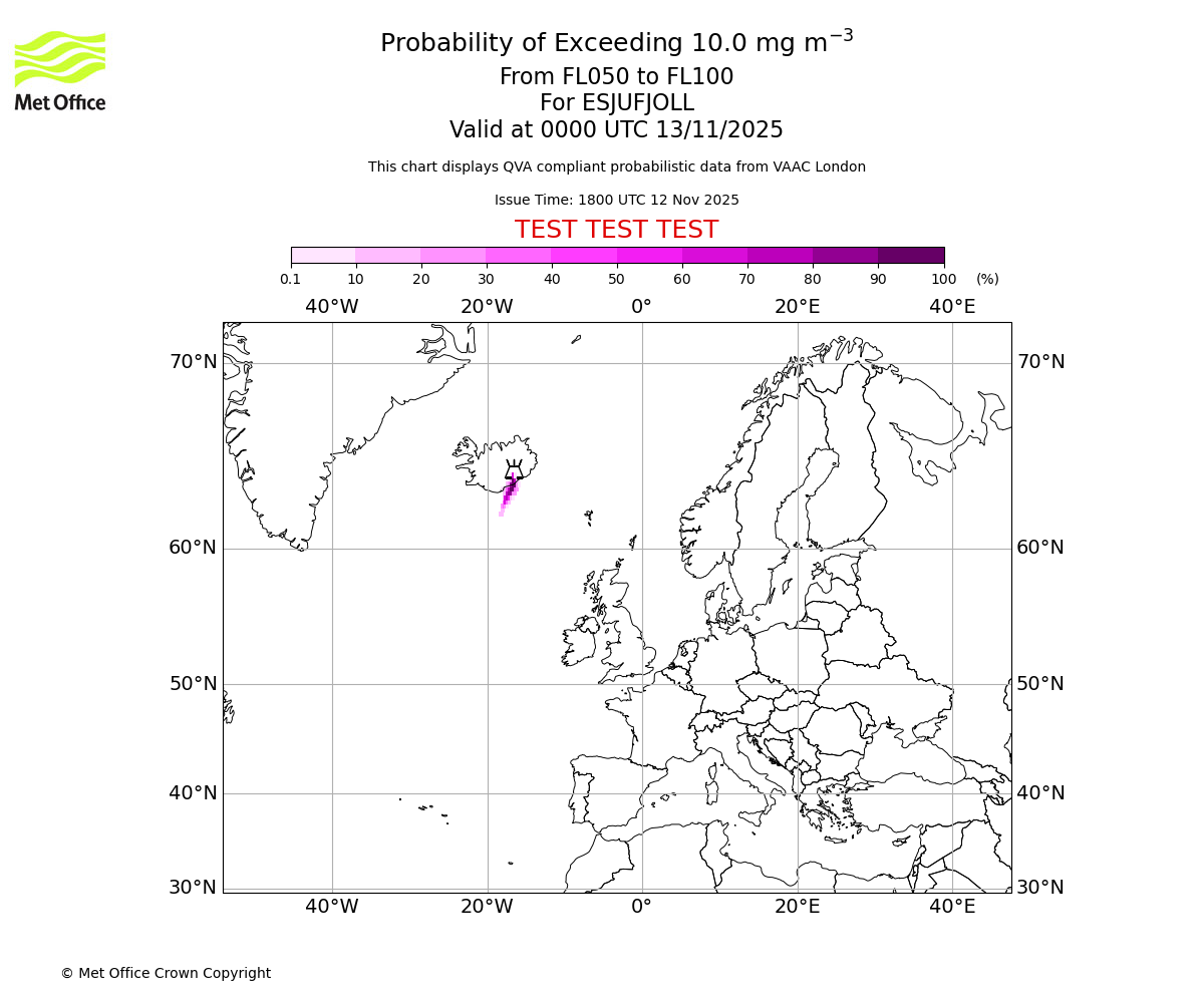 In accordance with ICAO Annex 3, Amendment 82 VAAC London will provide operational QVA forecasts from 27 November 2025 and these will be made available via a VAAC London QVA API information service. These charts are currently provided for test and evaluation purposes (not for operational use) until the introduction of the operational service.